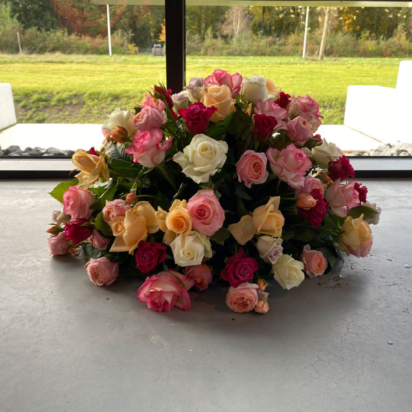 We maken rouwwerk op maat, uitsluitend met rozen. De stukken dienen zelf opgehaald te worden. De grootte en kleuren zijn bespreekbaar.